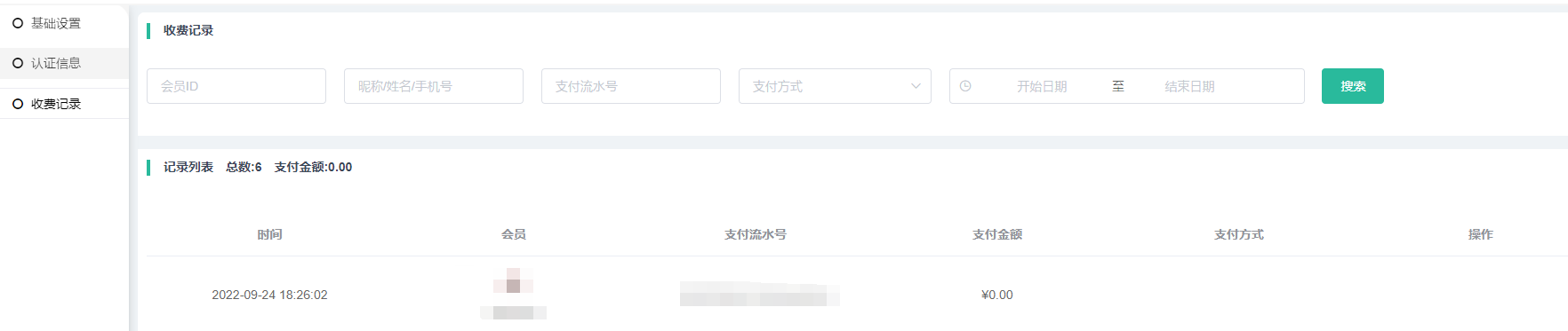 开启实名认证收费会显示在这里,记录列表显示有时间、会员、支付流水号、支付金额、支付方式、操作