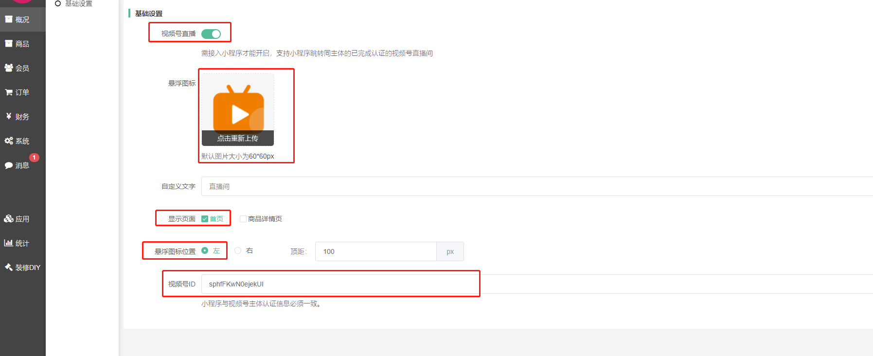 概述:后台进入视频号直播间插件,可设置视频号直播间的悬浮窗口在首页和商品详情页面显示、自定义悬浮图标图片、自定义文字、悬浮图标位置,跳转到微信视频号直播间观看直播、